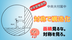 この問題は、斜線の形をそのまま追いかけると、途中で見失いやすい問題です。 まず「迷子になっている」と気づき、図全体を俯瞰します。 そこで「この図は対称(たいしょう)が使えるかもしれない」と仮説を立て、 対称を手がかりに、 […]